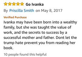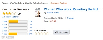 差评的声音,多半是讽刺千金伊万卡不懂人间疾苦的,他们质疑这本书太肤浅,百无一用。推特上还有一些“倒普”派,不满特朗普总统,顺带着也不满这本书了。