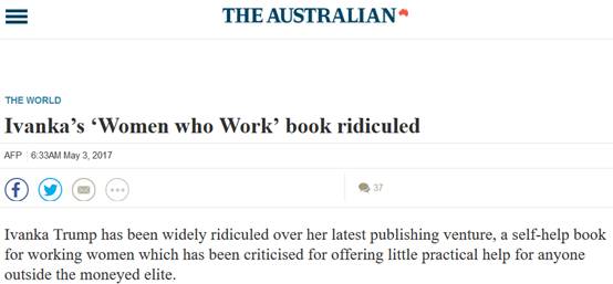 《澳大利亚人报》写道:伊万卡·特朗普的新书遭到大片讥讽,这本写给职业女性的书并不能给精英阶层之外的女性任何建议,因此遭到批评。