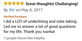 Shari Sauer:畅销书就是最好的证明!大推!别受那些政治左派的影响,他们都是嫉妒。伊万卡是好榜样,工作准则很棒,鼓舞人心。