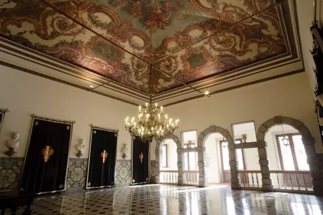 Its interiors feature paneled ceilings, decorated with murals, medallions, and paintings.