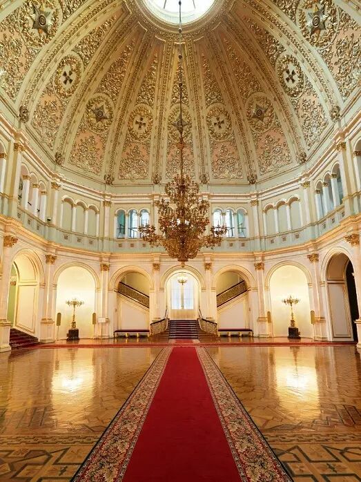 宫殿内精雕细琢的穹顶,华丽的吊灯、红毯。