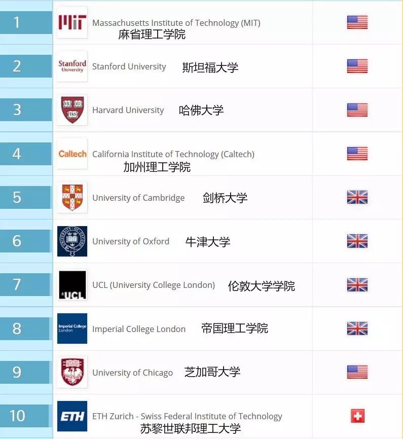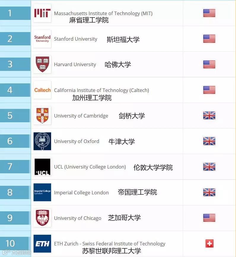榜单上前十名高校均来自于欧美国家,与去年一样,麻省理工学院(Massachusetts Institute of Technology)再次位居榜首。