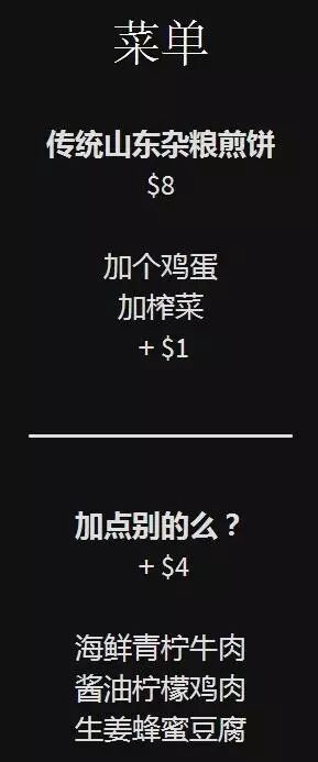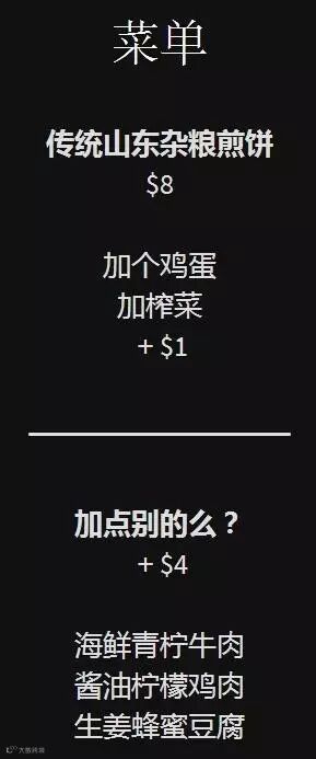 对,主要是价格!最贵的一套煎饼卖到15美元!相当于人民币100多块钱!