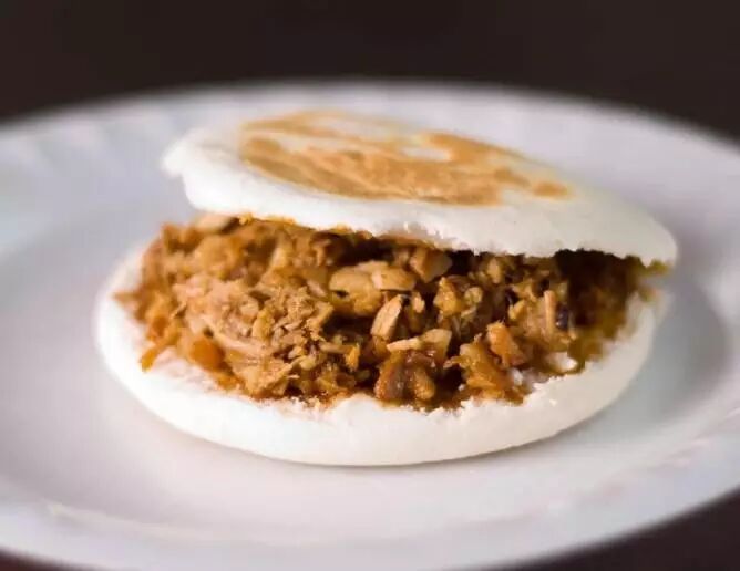 肉夹馍好吃,馍有一半的功劳。它没有什么味道,非常紧实,有点像百吉饼。表皮有点脆,芯又有点嚼劲,比较干,充分吸收了肉馅的汁。