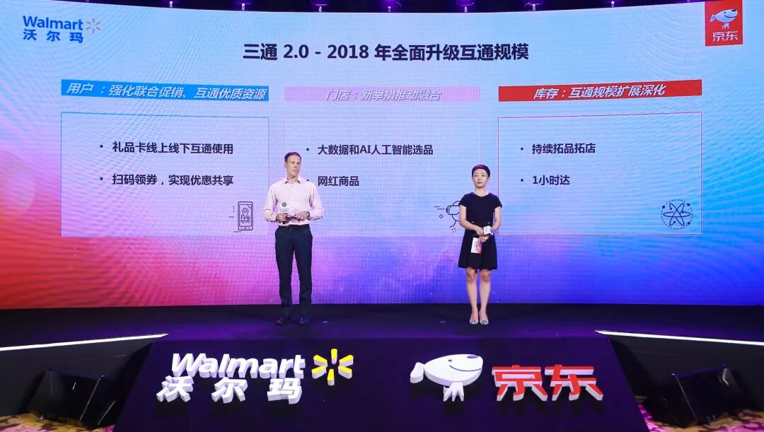 京东和沃尔玛两大零售巨头,掌握着线上线下的渠道优势,拥有强大的大数据分析能力和世界领先的供应链管理体系。双方去年启动了用户、门店、库存互通,今年在此的基础上升级合作,推出代表线上线下融合的“三通2.0”战略。
