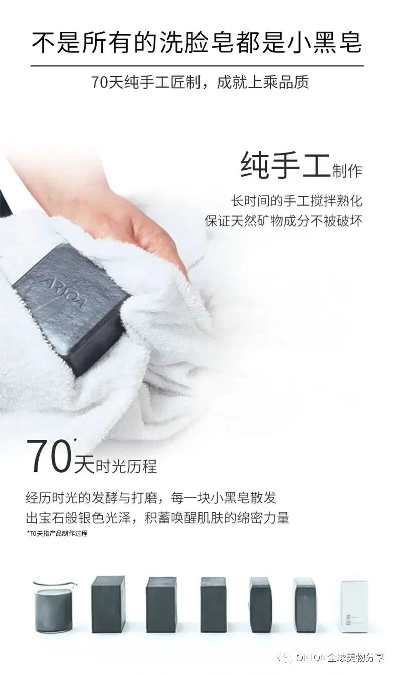 比起从生产到出厂继续几天的洗面奶与机器皂,小黑皂只用少量皂基搭配矿物质。经过80天的纯手工制作,搅拌、冷却、凝固、熟成、打磨、抛光等多重工序,最大保留天然保湿成分