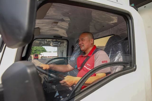 ▲ 京东物流传站车司机老李在氢能源物流车的驾驶室