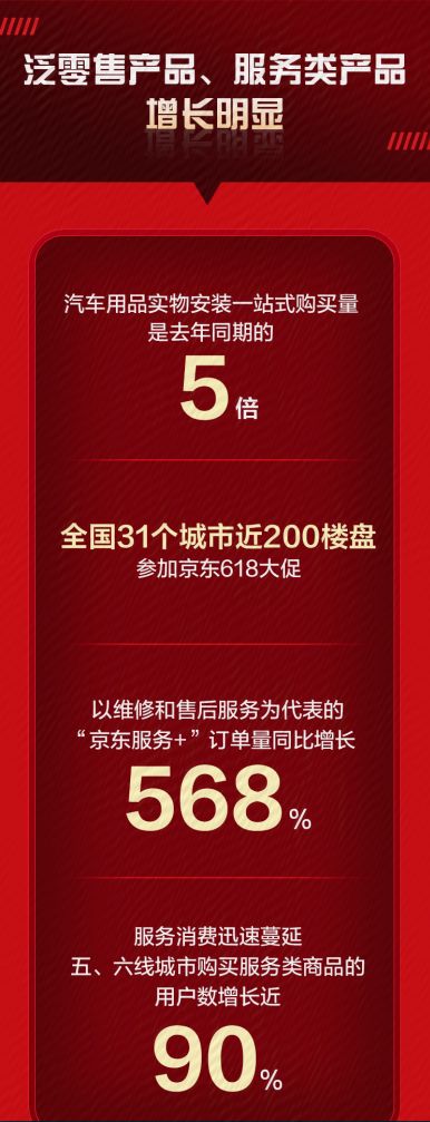 数据显示,6月1日至6月18日,75英寸以上及OLED高端电视销售同比均超10倍,戴森、莱克为代表的高端吸尘器销售额是去年同期的3倍,叮咚智能音箱销量同比增长12倍,进口生鲜销量是去年同期的2.5倍。另外,服务消费迅速蔓延,汽车用品实物安装一站式购买量是去年同期的5倍,以维修和售后服务为代表的“京东服务+”订单量同比去年增长568%,高端、智能类以及服务类商品销售的大幅提升,正说明用户的购物决策不再以价格作为唯一考量因素,而是兼顾对品牌、品质、服务与价格等多重因素进行综合考量,品质化消费特点展露无遗。