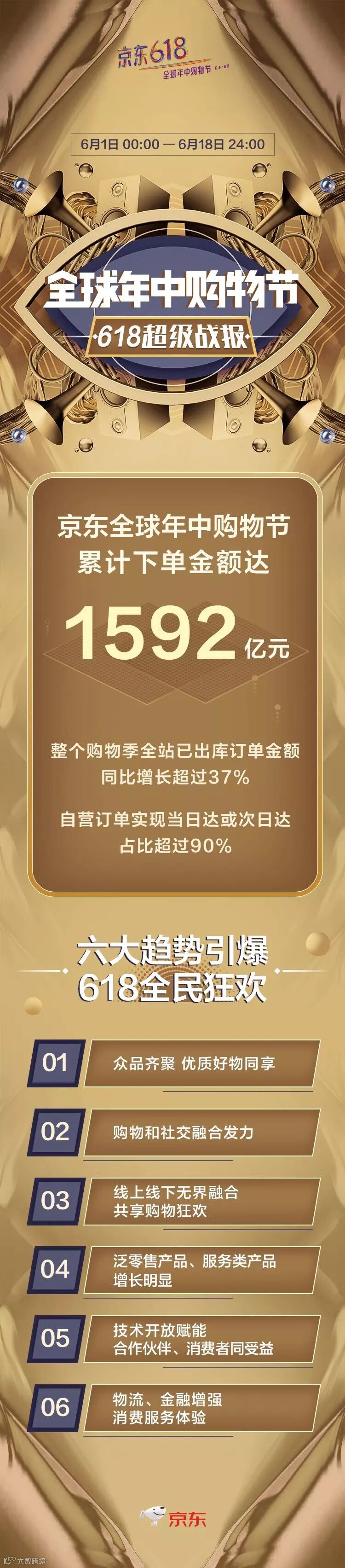 6月1日0点京东618全球年中购物节正式开启,截至6月18日24点累计下单金额达1592亿元,整个购物季全站已出库订单金额同比增长超过37%。