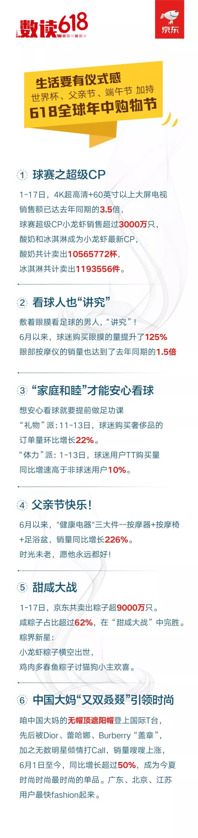 京东全球年中购物节迎来最高潮,截至6月18日00点10分,累计下单金额达1275亿元,冲顶新高。同时,购物节恰逢端午节、父亲节和世界杯,关联商品的销售热潮此起彼伏,节日和热点带动的消费趋势明显,生活还是要有仪式感的。