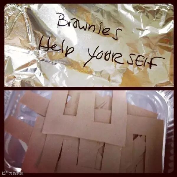 如果你喜欢双关语,又乐于用美味的巧克力蛋糕做诱饵整一整身边的吃货,这一招绝对适合你——炮制一盘外包锡纸上写有巧克力布朗尼字样的假甜点,里面装着的却是棕色纸剪出来的E!做这款"蛋糕"自然用不到烤箱,不过,真相败露后,你可能会被一群又气又饿的吃货围攻,别怪我没提醒你哦!