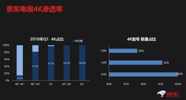 在这一消费趋势下,家电品牌商们纷纷加大对4K电视产品的研发和投放,京东平台的4K电视占比也从2014年的4%逐年上升到2018年第一季度的73%。统计显示,截至2018年第一季度,58-60英寸和65英寸4K电视在京东平台的渗透率已达100%,55英寸4K电视的渗透率也已达到97.5%。从电视尺寸来看,大尺寸电视的4K份额占比更高,说明“大屏+高清”正在成为电视品牌商们的发力主阵地。