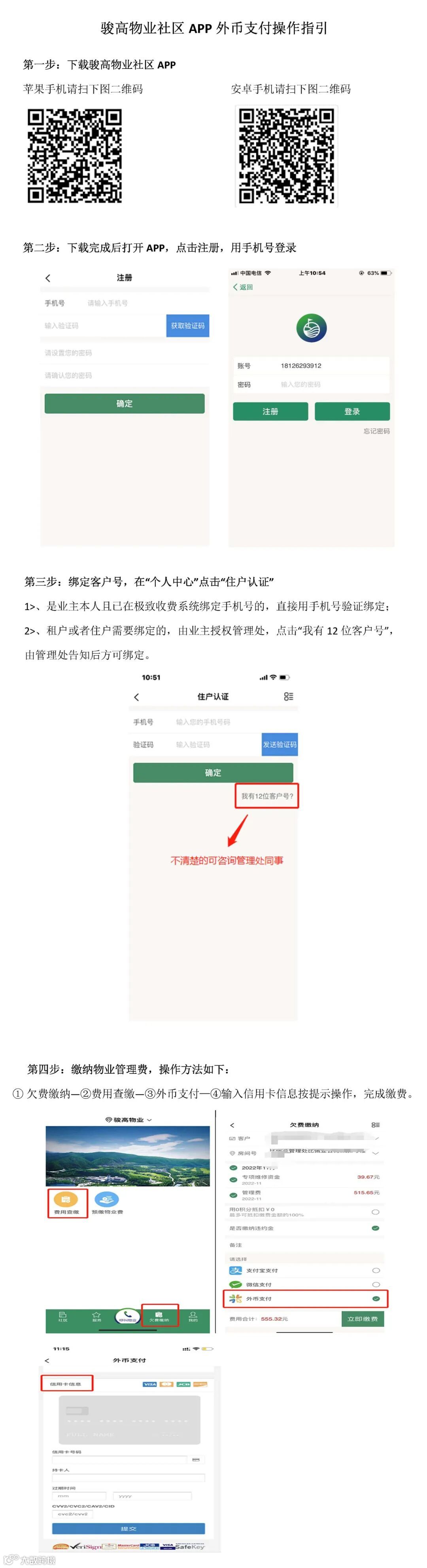 为了更方便业主/住户缴纳管理费,骏高物业已在“骏高物业社区”APP(手机软件)中增加了外币支付方式,支持国际信用卡及储蓄卡缴纳物业管理费等。