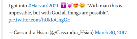 近日,17岁的美国华裔女孩萧靖彤(Cassandra Hsiao)收到了所有藤校的录取通知书。