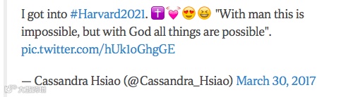 萧靖彤从小就很喜欢哈佛大学,曾在7年级时去哈佛大学参观在收到哈佛的录取通知书后,萧靖彤激动得马上发了一条推特
