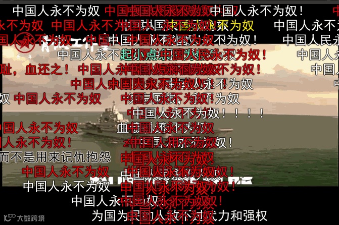 在这个只有3分26秒的视频里,有7338条弹幕,“家国需要我时,就是我参军之日”、“中国人,永不为奴”、“犯我中华者,虽远必诛”等弹幕随着视频里激情昂扬的背景音乐不断出现。