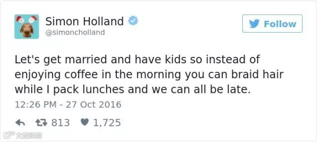 我们结婚吧!这样我们就可以每天早上照顾小孩而不是享用咖啡了,你帮她们编辫子,我帮她们打包午饭,然后咱们就可以一起迟到啦!