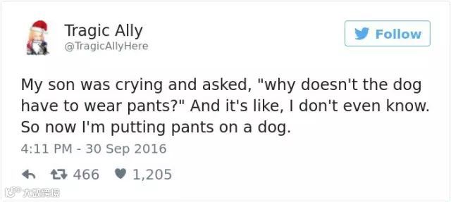 我儿子边哭边问我,“为什么狗狗不穿裤子啊?” 我……也不知道……所以现在我在给狗穿裤子……