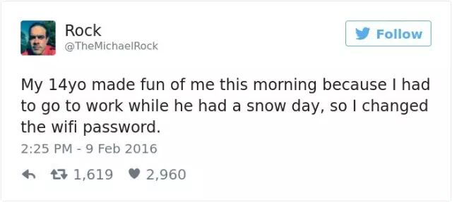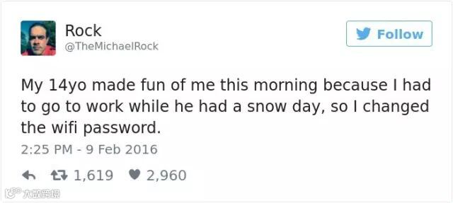 我那14岁的孩子今早嘲讽我,因为我要去上班,他却能因雪停课,休息一天。然后我只能默默地……把wifi密码改了。