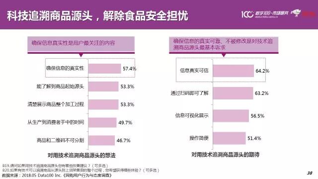 对食品安全的担忧恐怕是当前消费者最关心的问题了,从调研的数据也能够看到,有68.5%的人将商品质量安全放在了自己最关心的问题首位。随着区块链技术的出现,将有望彻底解决商品溯源的问题,消费者只要扫描二维码就可以方便的获得商品来源、生产日期、加工过程、销售渠道等信息。有效防止造假,使整个商品的生活、运输流程清晰可查。