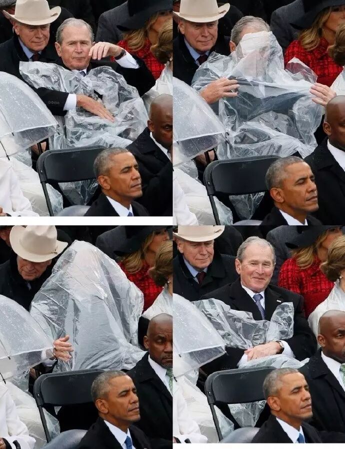这会,台下的奥巴马一脸生无可恋,而后面的小布什一直在跟雨衣搏斗……