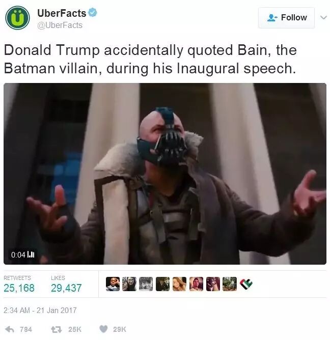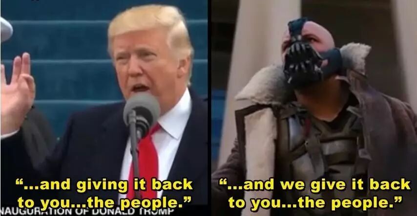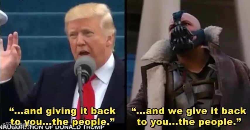 但网友的关注点永远是最奇特的,他们发现特朗普的演讲中竟然引用了《蝙蝠侠》中大反派Bane的一句台词……