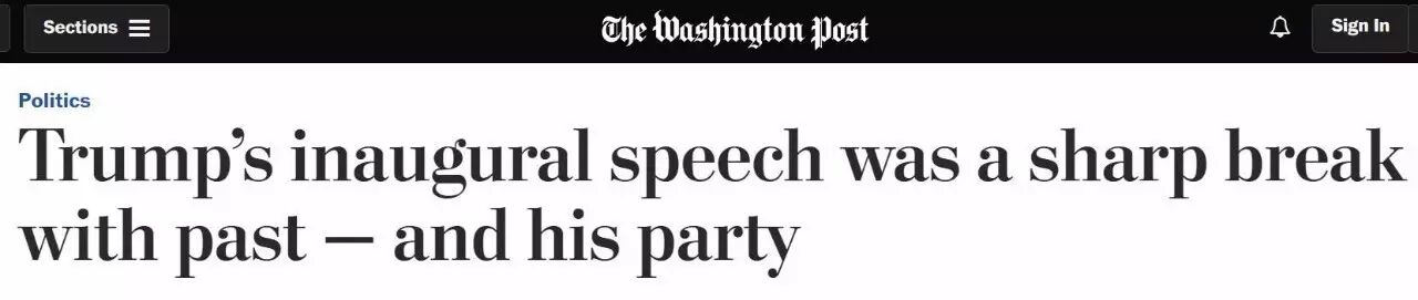特朗普语气中无一丝妥协,完全忠实于自己在竞选时的反叛论调,直接省去了团结各方的呼吁和与对手和平相处的打算。他将这个国家的政界批得毫无信用、贪腐成灾,而这群人当时就站在国会大厦西首、他的身后。