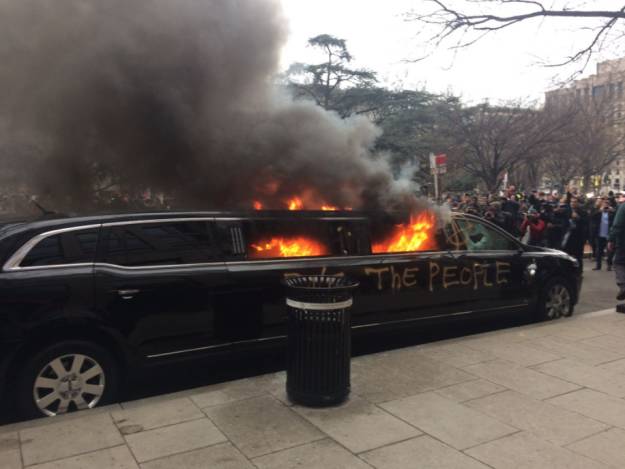 There were several big protests that concentrated into one, led by the group DisrputJ20. Rioters smashed a bank and windows and lit a limousine on fire.