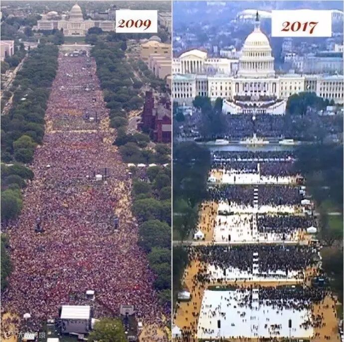 这是2009和2017年的美国总统登基大典场外人数对比图,心疼特朗普三秒。