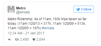 华盛顿大都会地铁局表示,截止当地时间1月20日上午11点(特朗普就职仪式开始一个小时前),搭乘地铁的乘客数量不到2009年同一时间的一半。