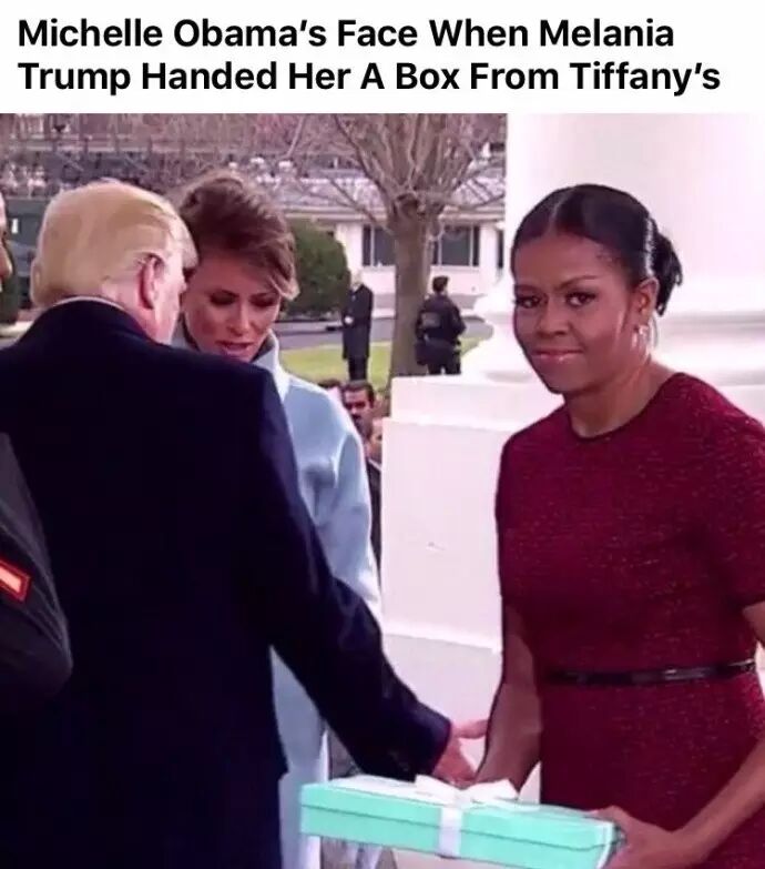 梅兰妮亚(Melania)还给米歇尔送了一份看上去异常贵重的Tiffany礼盒,然而米歇尔收到礼物的表情是这样的: