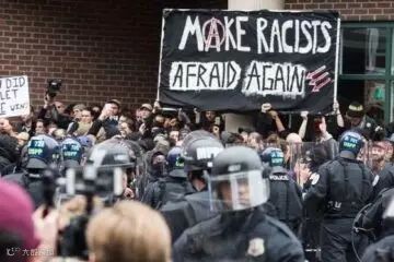 抗议者们手持“令种族主义者再次恐惧”(Make Racists Afraid Again)的标语,与特朗普的“令美国再次伟大”(Make America Great Again)相对应。