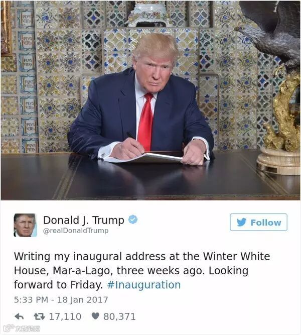 而且,特朗普的就职演说词是自己写的哦,他还在推特上发了一张自己提笔深思的照片留念:
