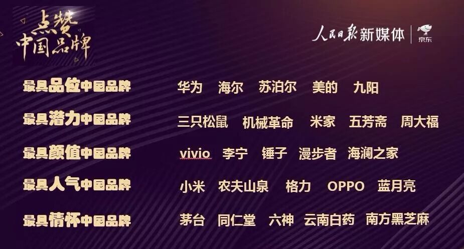 今年中国品牌日前夕,人民日报新媒体和京东共同发起“中国很赞▪点赞中国品牌”活动,围绕中国质造、中国设计、中国传承的内涵,评选产生了“最具品位”、“最具潜力”、 “最具颜值”、 “最具人气”和“最具情怀”等五个维度中国品牌榜单,华为、vivo、三只松鼠、茅台等25个优秀中国品牌最终上榜。