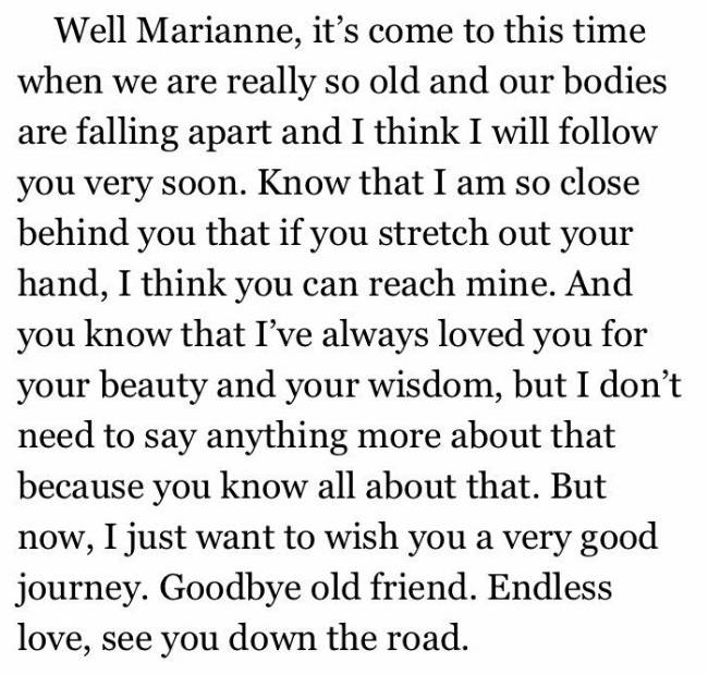在玛丽安·伊伦病重期间,科恩给她写了一封感人肺腑的告别信。