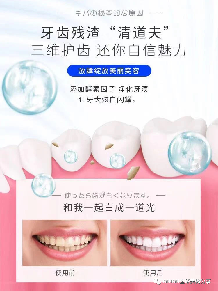 酵素能有效分解,除去隐藏的牙垢,还能有效去除咖啡、红茶等带色饮料污渍,有效去除烟渍,强化牙齿,预防蛀齿,深度美白牙齿,预防口臭