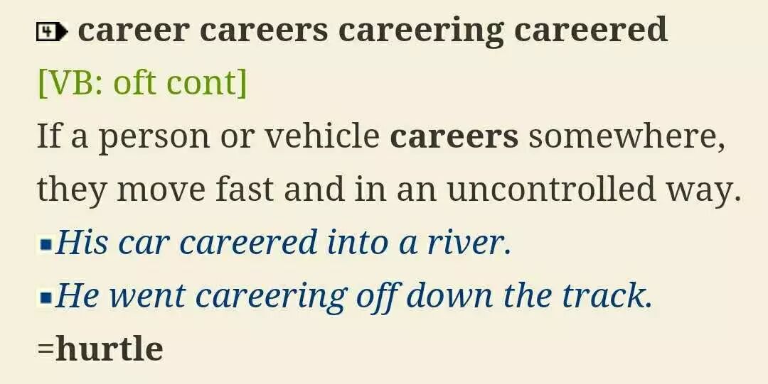 句子里面 career 如果用“职业,事业”来理解显然不合逻辑,查了词典之后你会发现,它在这里是指“车辆失控猛冲”: