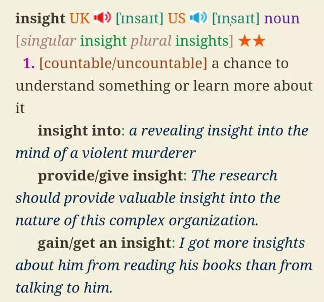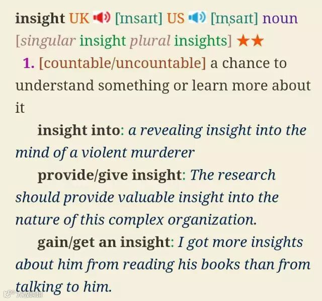上面这几条例句很好地解释了 insight 的用法:与 insight 常见的介词搭配是 into, “提供关于……的洞见”可以说 give/provide insight into...,“获得关于……的洞见”可以说 gain/get insights about... 第二条例句还提供了一个句型:The research provides valuable insight into ...