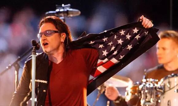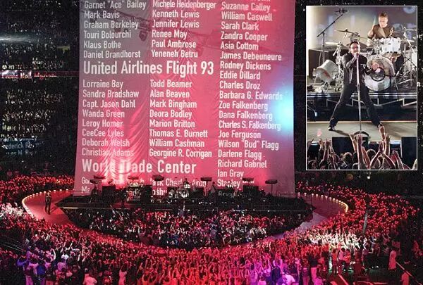 2002年U2演绎了最催泪的超级碗中场秀。911事件发生后,NFL将当届超级碗中场秀主题定为纪念911,心形舞台表达了对逝者的哀思,巨型银幕上滚动播放遇难者名字。