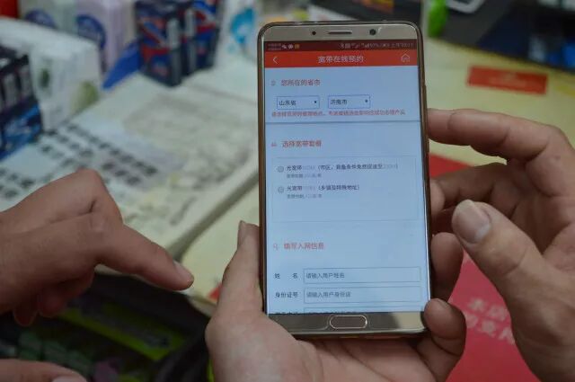 ▲ 山东济南京东便利店店店主徐柏林正在为客户办理联通宽带申请业务