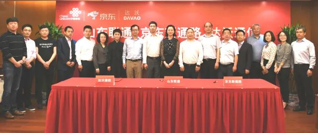 ▲ 京东新通路与山东联通、达沃通信举行合作运营签约仪式