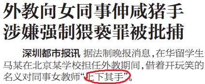 ▲ 《深圳都市报》11月9日《外教向女同事伸咸手涉嫌强制猥亵罪被批捕》文中的“上下其手”用法不妥。“上下其手”不是“猥亵”,不是“耍流氓”,不是“性骚扰”,比喻暗中勾结,随意玩弄手法,串通作弊。