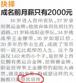 ▲ 《重庆商报》11月8日第8版《拳头打出钱途》文中的“望其项背”用法不妥。“望其项背”表示赶得上或比得上,多用于否定句中,文中的“只能”改为“不能”或“难以”就妥了。