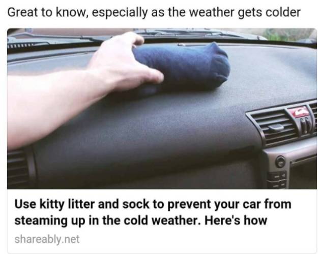 ➅ Fill a sock with (clean) kitty litter and place it in your car to prevent your windows from fogging up when driving.