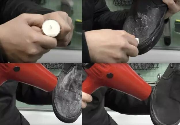 用蜡烛在鞋子上涂上一层蜡,然后用电吹风吹到融化,你的鞋上就多了一层薄薄的防水层啦。