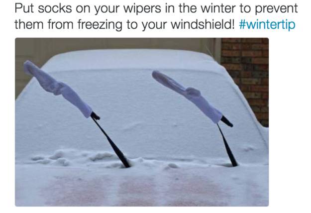 ➄ Use an old pair of socks on your windshield wipers to prevent them from freezing and sticking to your windshield overnight.