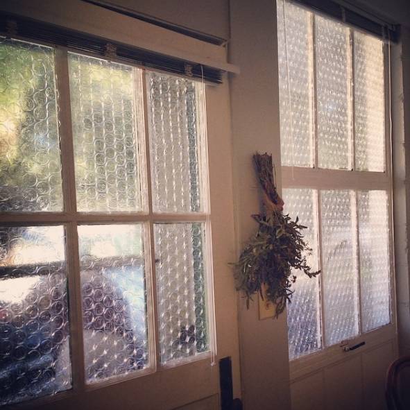 ➃ Spray water on your windows with a spray bottle, then apply bubble wrap on top of the panes to keep the heat inside by insulating on a budget.