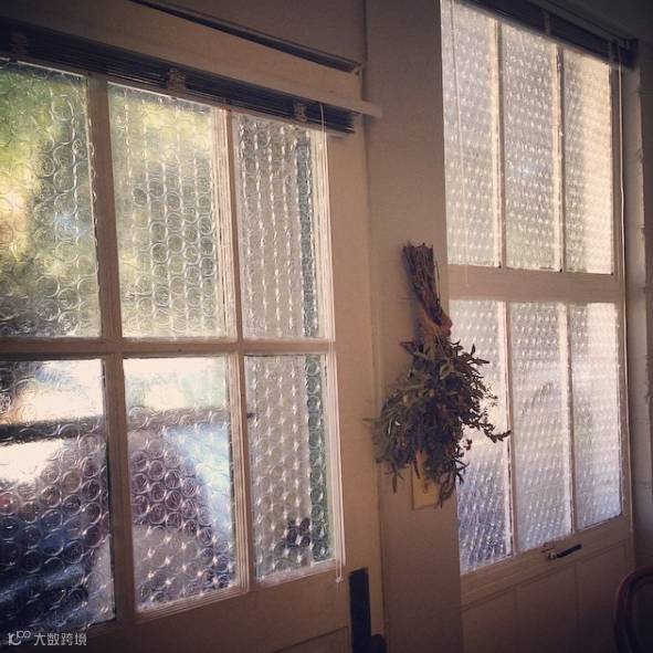 用喷壶在窗户上喷上水,然后把气泡膜贴在窗格上,这样不花什么钱就能起到隔热效果。