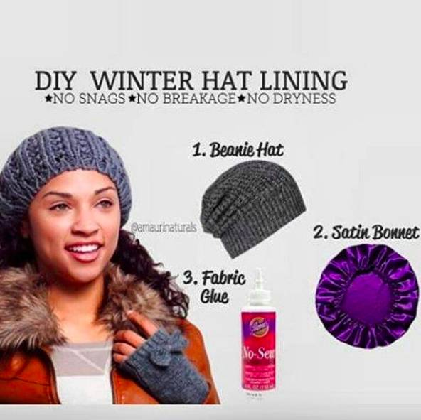 ➆ Sew a satin bonnet on the inside of your beanie to keep it from absorbing your natural oils and preventing your hair from breaking in the cold, dry air.