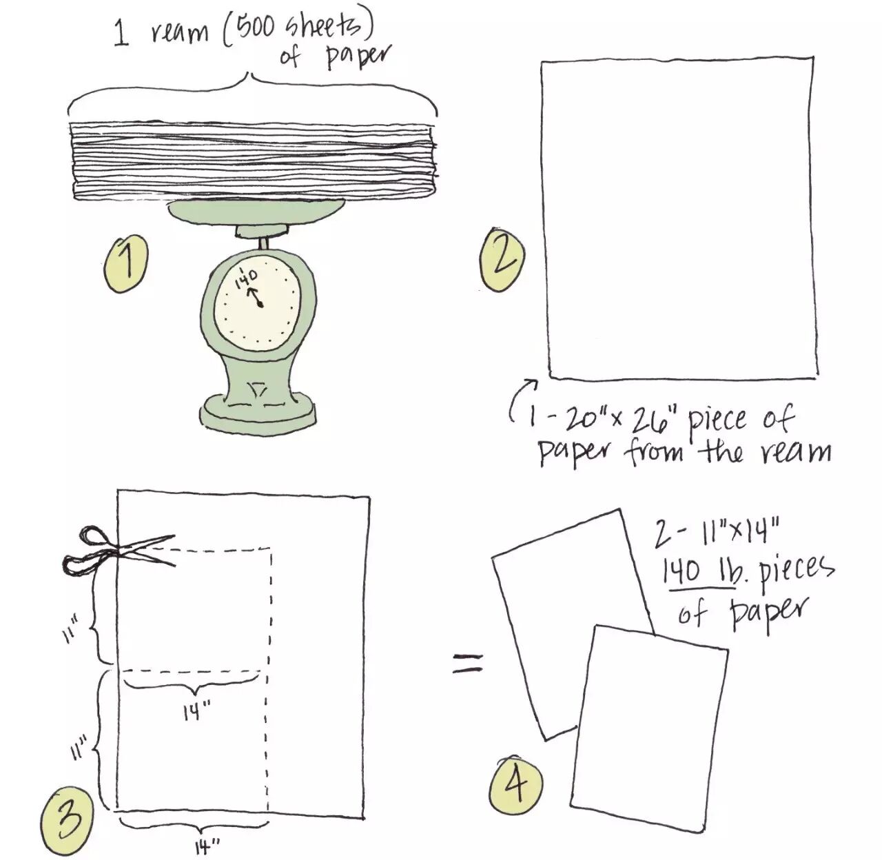 4、裁剪出的标准纸张,就被标注该一令纸的重量。如图所示的这两张11″x14″尺寸纸,就被标上“140磅纸”的标记。